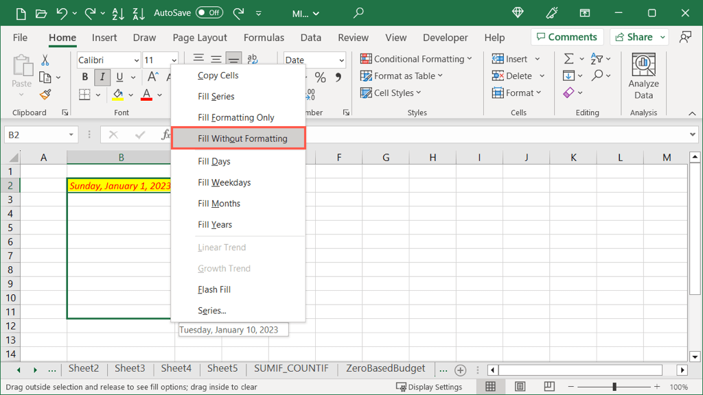 Maybe you want to do the opposite of the above. You can fill the data but remove the formatting. Here, we’ll use a cell with the same formatting as above; however, we only want to fill the dates.