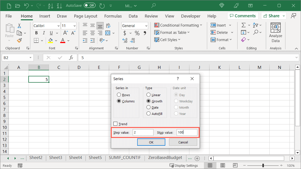 - Enter the Step value which is the number you want to multiply each cell by. Optionally, enter a Stop value which is the number you want to end the series by. Select OK.