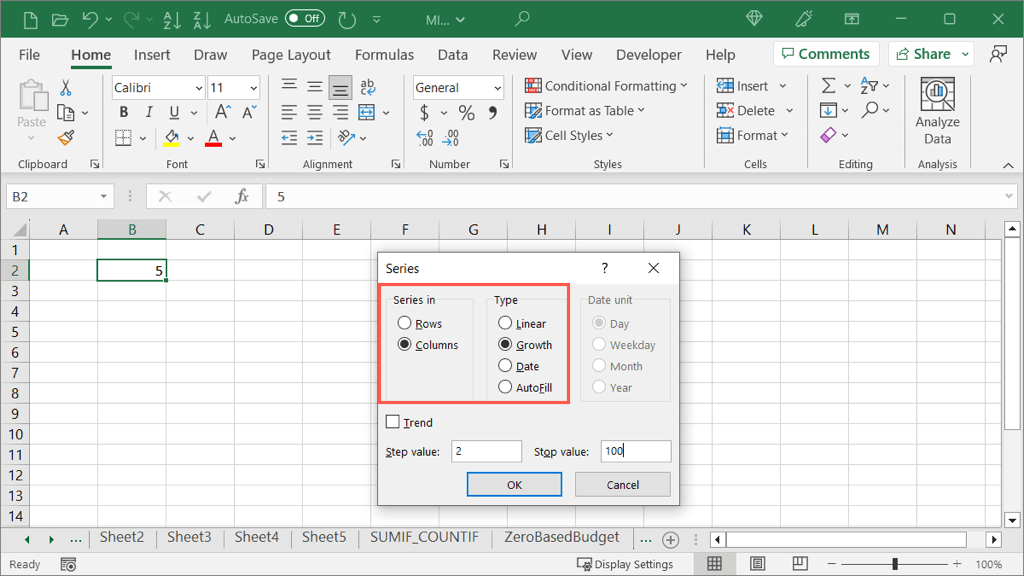 - In the box, mark the options for Rows or Columns for where you want to fill and Growth as the Type. Note: The Trend checkbox performs the same action as the Growth Trend option above when using the Fill Handle.