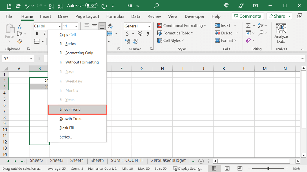 Here, we have numbers 20 and 30. With the Linear Trend Autofill, we can fill the remaining cells with each increasing by 10 because this is in the increase between 20 and 30.