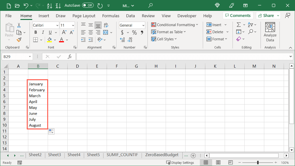 Starting with the simplest task you can perform with Excel Autofill, you can easily fill a list of items. This includes built-in lists or custom lists you create.