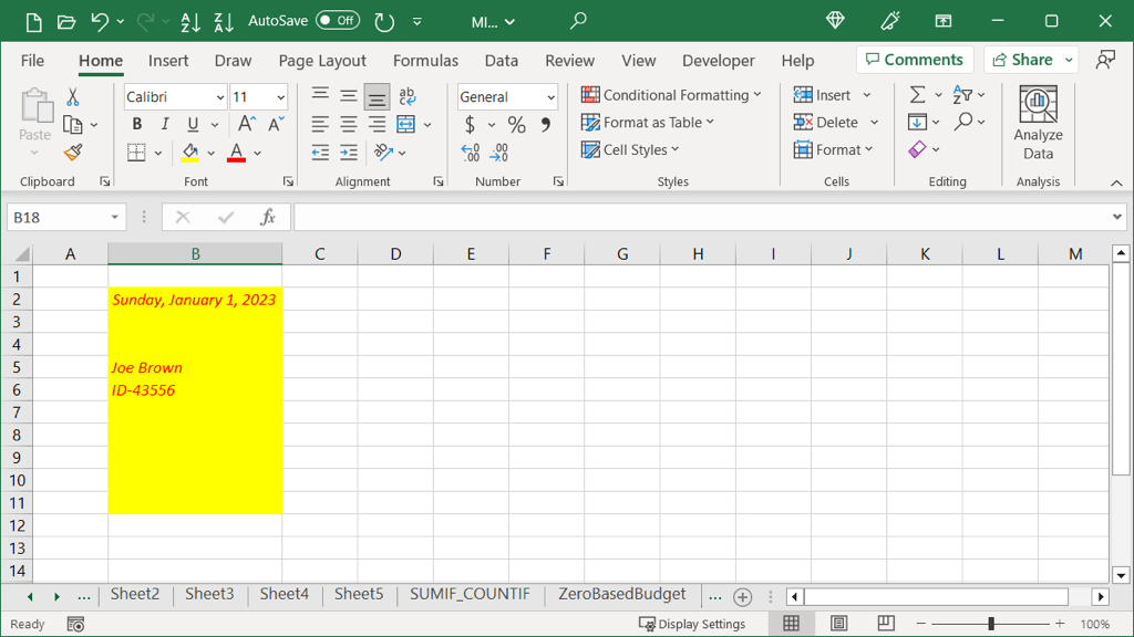 Here, we have a cell formatted with red, italic font and a yellow fill color. We plan to enter other data in the cells unrelated but want to copy that formatting to save some time.