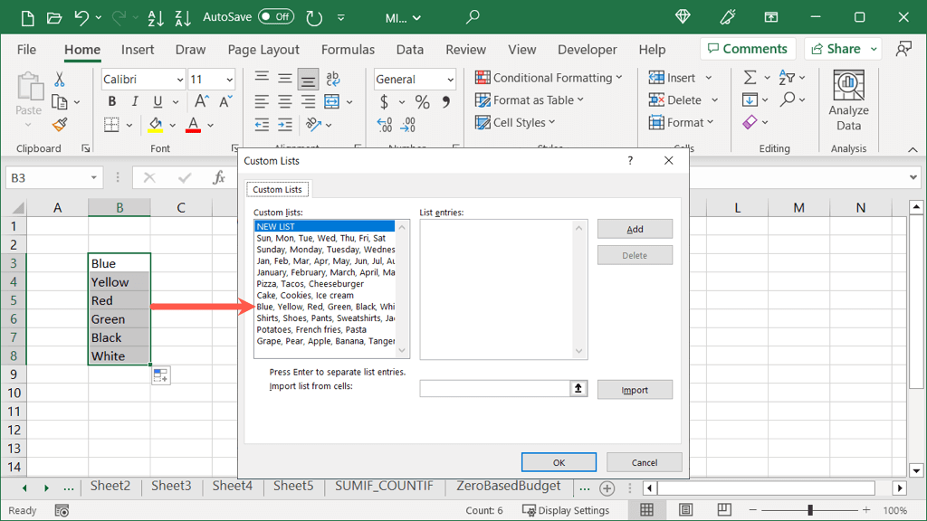 If you have custom lists set up in Excel, the application recognizes this as you use Autofill too. Here, we have a custom list of colors that we can enter using Autofill.