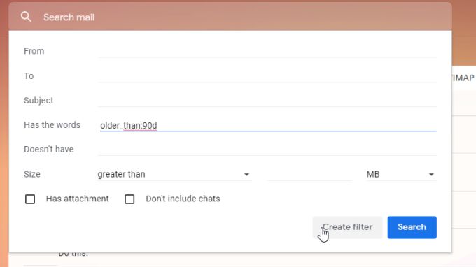- In the pop-up window for the filter, in the Has the words field, type older_than:xxd. You can replace xx with any number, and d with any time interval like “m” for months or “y” for years. Select Create filter to continue.
