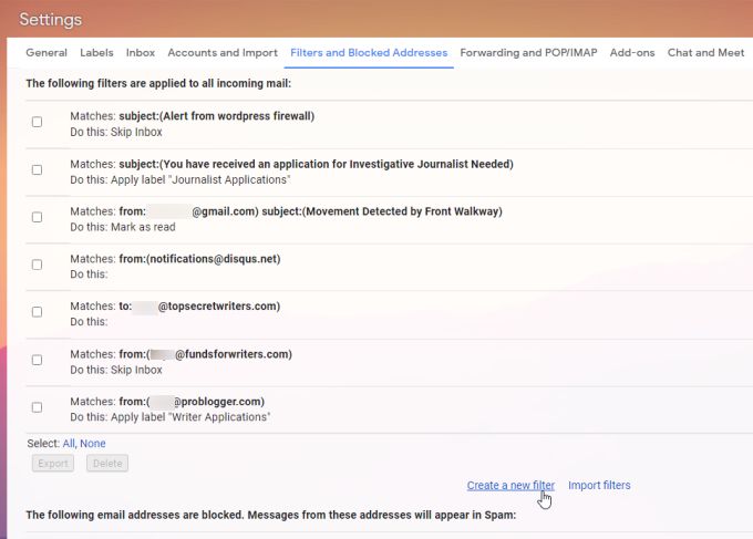 Open Gmail settings and select Filters and Blocked Addresses from the menu.