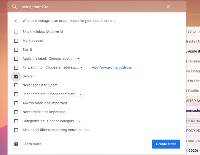- On the next window, select Delete it, and then select Create filter.