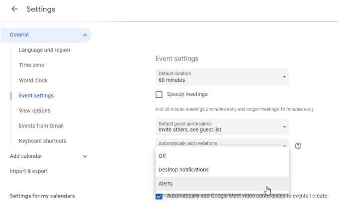 - Finally, go into Google Calendar settings, select Event settings from the left menu, and under Notifications change Desktop notifications to Alerts so that you’ll get alerts on your mobile for these Google Calendar reminders.