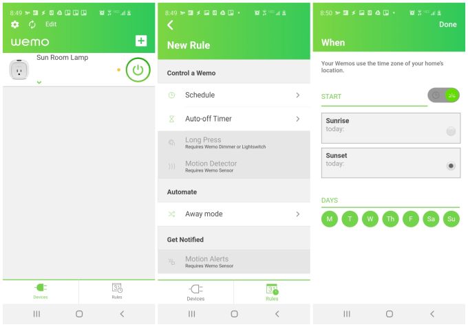 In fact, many of these smart home apps let you use your location to set lights to turn on at sunset and off at sunrise. Or, if you want to schedule lights or other devices to turn on or off at set times of the day, you can do that too.