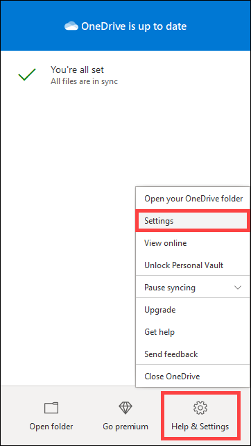 - Select the OneDrive icon on the system tray and go to Help & Settings > Settings.