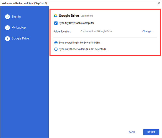 - Select Start to finish setting up the Backup and Sync client.