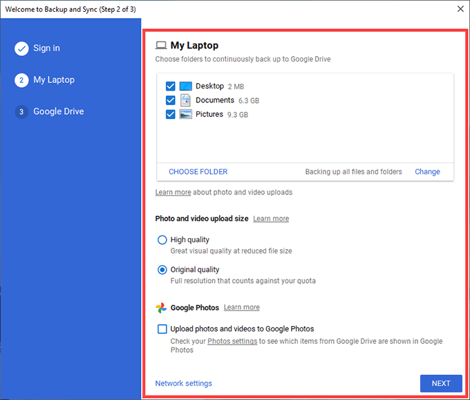 If you pick the Pictures folder, you must select your photo upload preferences—**High quality **or Original quality. The former compresses photos and videos to the 16MP and 1080p resolutions, respectively, while the latter uploads them at full quality.