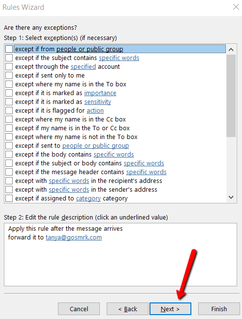 Then you will be prompted to select the conditions for the messages that get forwarded. As to the specific conditions you select, it’s totally up to you.