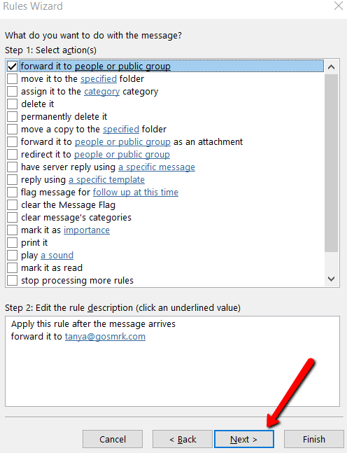 Under Step 2, make sure the field also says Apply this rule after the message arrives. Then hit Next.