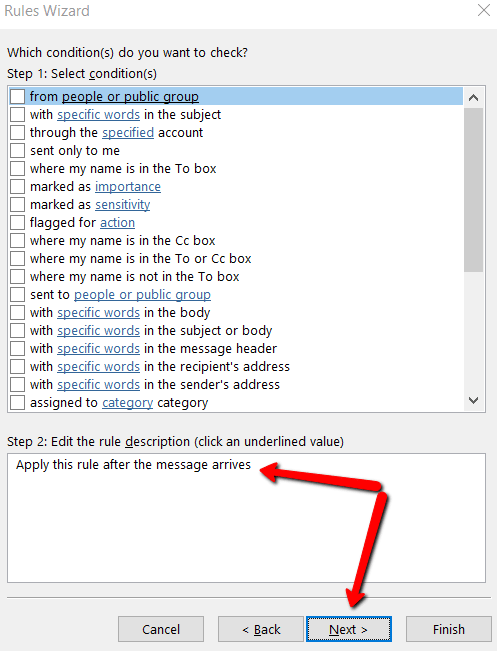 Under Step 2, make sure the rule description says **Apply this rule after the message arrives **and hit Next.
