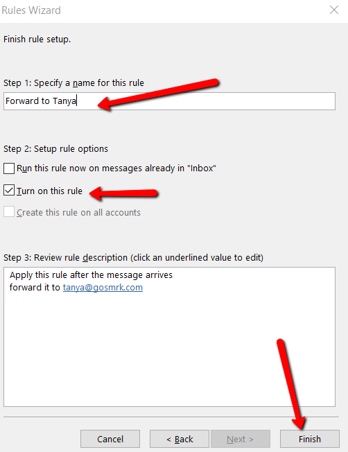 Tick the box that says Turn on this rule. Once you review the rule description in Step 3, you’re good to go. It’s time to click Finish.