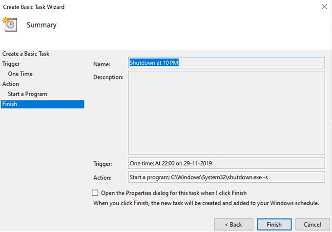 - You’re now on the final screen of the task. Confirm everything is in order and then click on Finish to finish creating the shut down schedule.