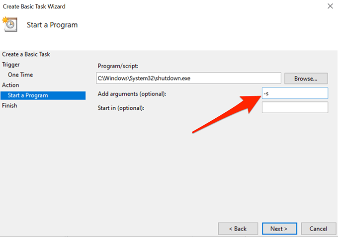 - The shutdown utility actually requires an ‘argument’ for it to shut down your machine. Enter -s in the field that says Add arguments so the utility turns off your system and not do any other tasks like rebooting or putting your PC to sleep. Then click on Next to continue.
