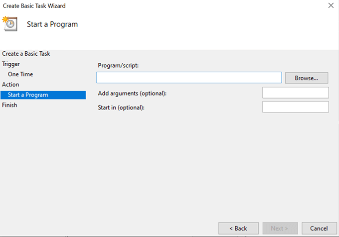 - It will ask what action you’d like to perform when the task runs. Select the option that says Start a program and click on Next.