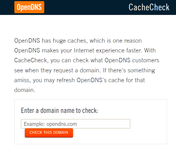 OpenDNS’ Cache Check is a tool that gives unique insights into how OpenDNS resolves your domain. It directly queries your domain using all OpenDNS servers and reports the results.