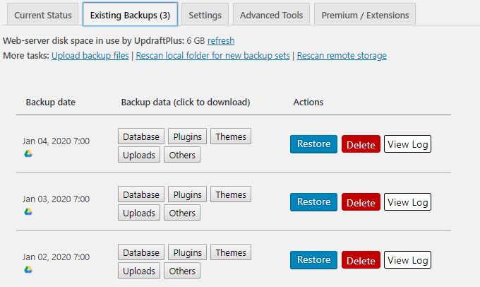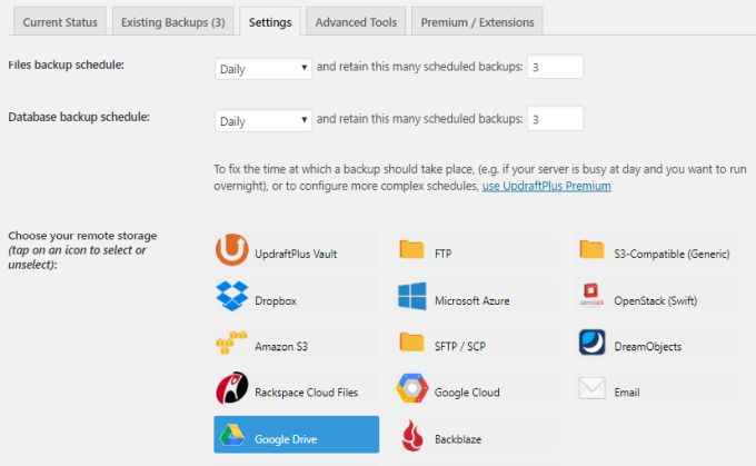 There are a lot of great WordPress backup plugins to choose from (see the list at the bottom of this section). The example shown below uses the UpdraftPlus WordPress backup plugin.