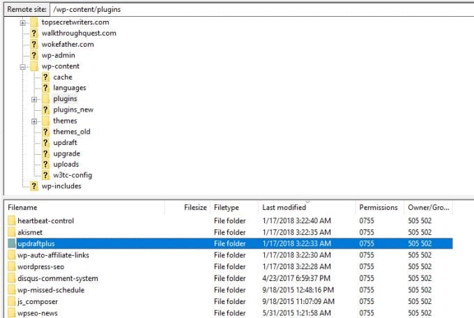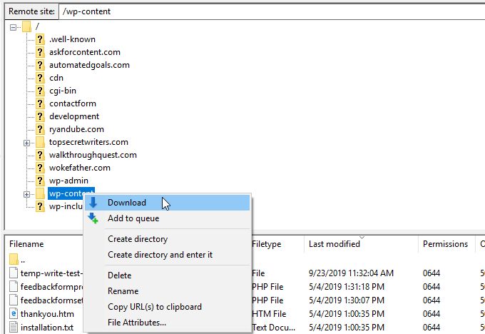 - Use the FTP client to download the entire wp-content folder and the wp-config.php file.