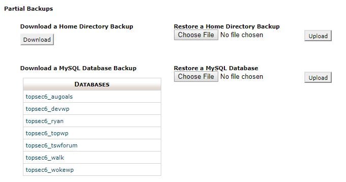 - Scroll down to Partial Backups, and under Download a MySQL Database Backup, select the link for the WordPress database you want to backup.