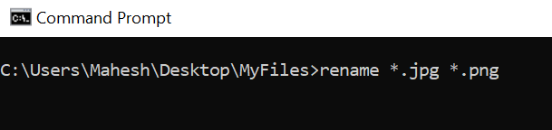 - To change extensions of your files, say from **JPG** to **PNG**, you can use the following command. **rename *.jpg *.png**