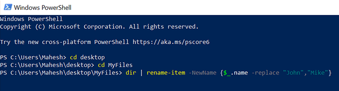- Type the following command into PowerShell and press **Enter**. This’ll replace **John** with **Mike** in all files in your chosen folder. **dir | rename-item -NewName {$_.name -replace “John”,”Mike”}**