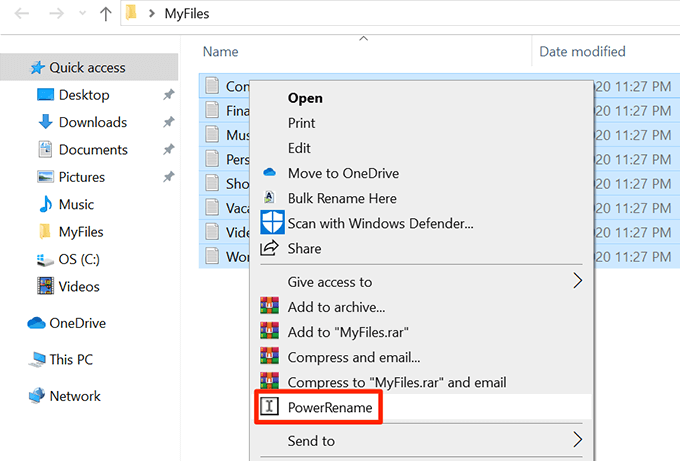 - Use **File Explorer** to open the folder where your files are located. * Select the files you want to rename. * Right-click any one file and choose **PowerRename**.