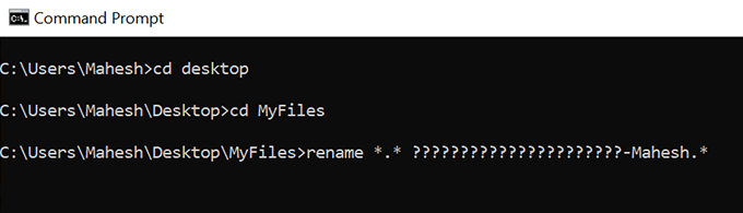 - To rename all your files and add a suffix to their names, say **Mahesh**, you can use the following command. **rename *.* ??????????????????????-Mahesh.*** Here’s what each parameter in the command means: **rename** – this is the command that lets you rename files from Command Prompt. ***.*** – this selects all files in the current folder. **??????????????????????-Mahesh.*** – the question marks denote the original names of the files, **Mahesh** is the new word you want to add, and the ***** at the end keeps the file extension the same as before.