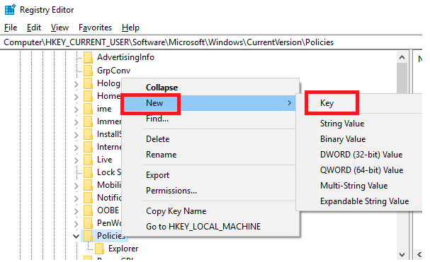 Don’t see the Explorer folder in Policies? You can** right click it and click New, then click Key. Once the new folder has been created, rename it to Explorer, then **click away from the folder to finalize the name.