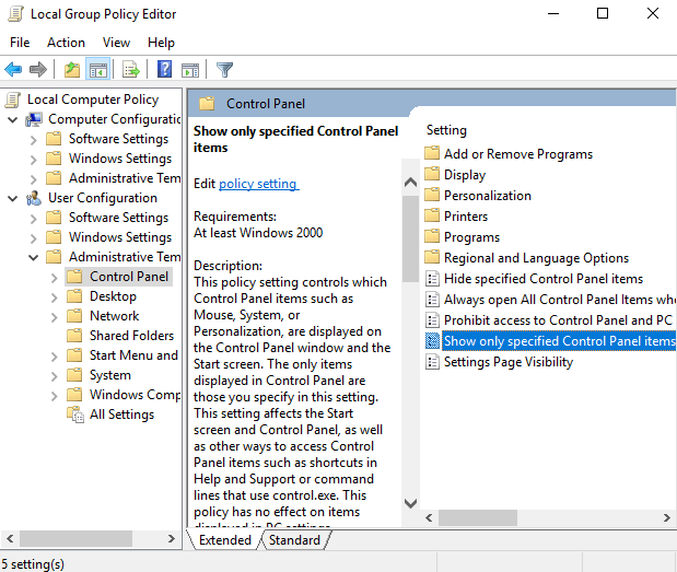 - Finally, on the right, double click on Show only specified Control Panel items.