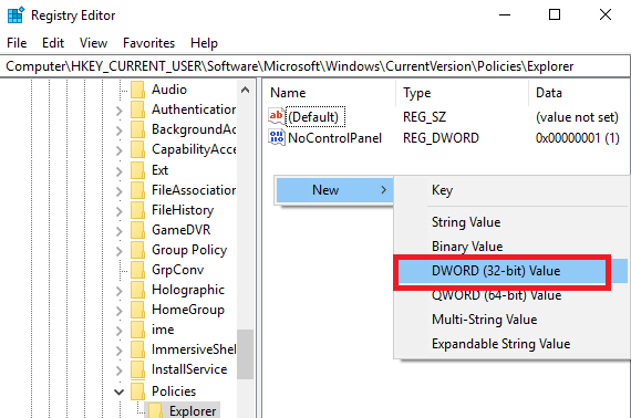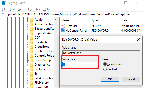 Where it says ‘New Value #1’, type NoControlPanel then press enter.** After that, **double click NoControlPanel and change the value data from 0 to 1. Click OK.