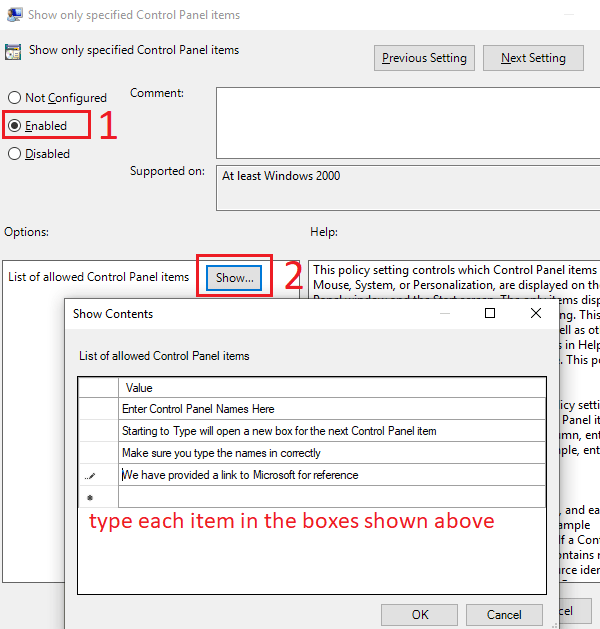 On the next window, click on Enabled. After this, you can click Show. From here, you can **manually enter each control panel item **that you would like a user to have access to. If it’s not included on this list, it will not appear!