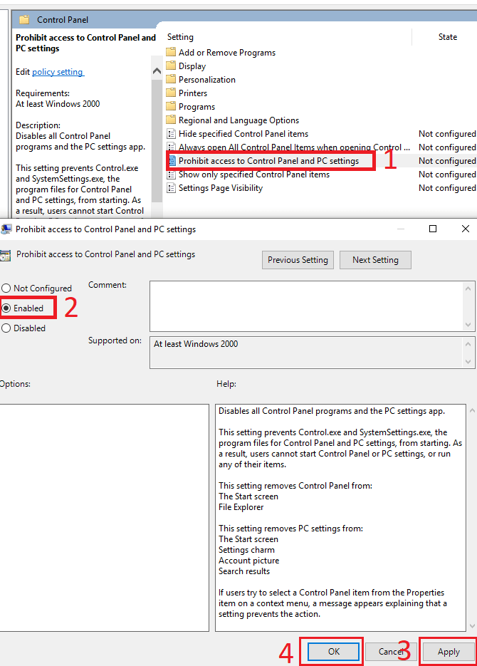 On the right side panel, double click Prohibit access to Control Panel and PC settings. Next, click Enabled. Then, click Apply. Finally, click OK.