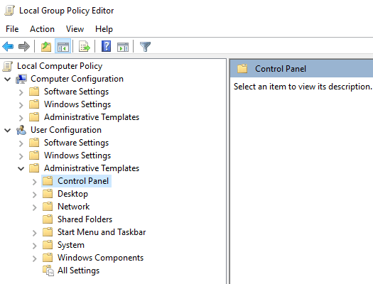 On the left side, click to open** Administrative templates** under the** User Configuration **section. Next, click on Control Panel.