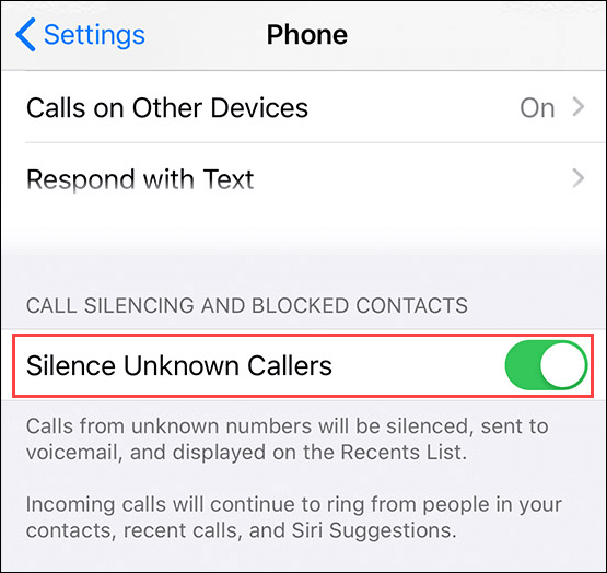 - About half-way down, tap on the slider button next to Silence Unknown Callers.