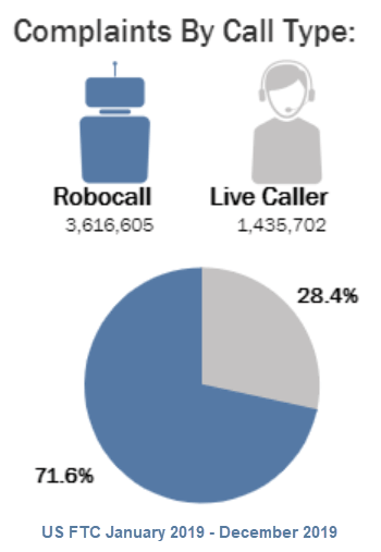 How much volume? In the U.S., over 4.7 billion robocalls in January 2020 alone. That’s an average of 14.4 calls for every person in the U.S.