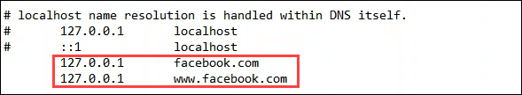 Enter the localhost IP of 127.0.0.1. Press the tab key and enter facebook.com. Press Enter to go to the next line. Create a second line like the one above, but use **www.facebook.com **instead of just facebook.com.