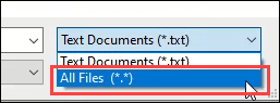 - Once there, change file type from **Text Documents (*.txt)** to **All Files (*.*)**.
