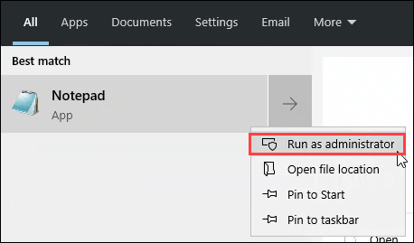 - Open **Notepad **as Administrator.