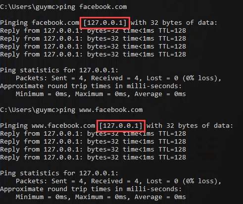 Open the command prompt and run ping facebook.com then run ping www.facebook.com. You should see that the IP address it’s trying to ping is 127.0.0.1.
