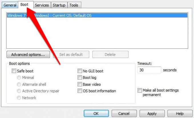 - Search for msconfig and then select the Boot tab in the System Configuration utility window.