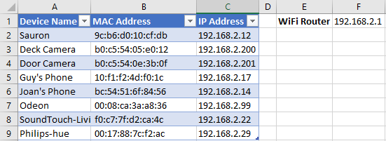 Write them all down as a list. Then you’ll need to find the Media Access Control (MAC) and Internet Protocol (IP) address for each device if possible, and write those down as well. The MAC address of our devices never changes, but the IP address can change frequently. That’s why we’ll want both of them.