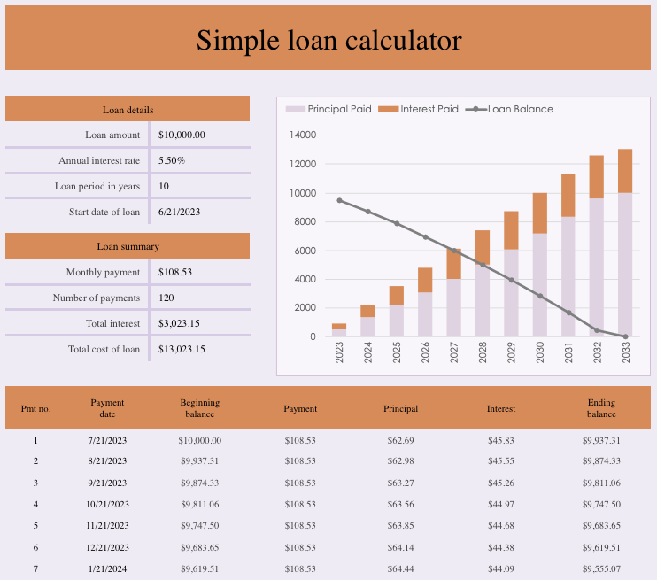 For personal loans, you can see a helpful chart and amortization schedule until your loan is paid off with this simple loan calculator template.