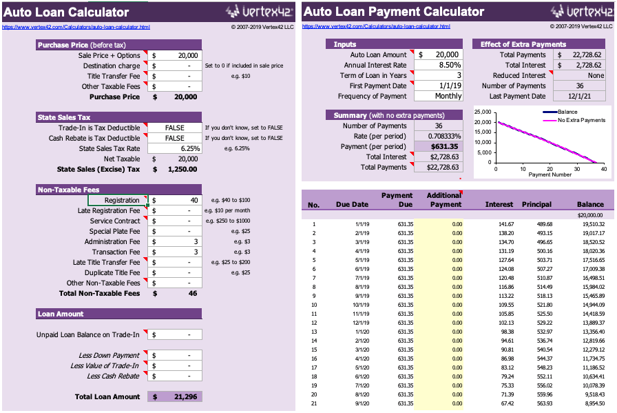 Next, enter your loan details on the Auto Loan Calculator tab including purchase price, loan amount, down payment, trade-in price, transfer fees, sales tax, and miscellaneous fees. You’ll then see your payment schedule on the Payment Calculator tab with a table showing dates, interest, principal, and balance.