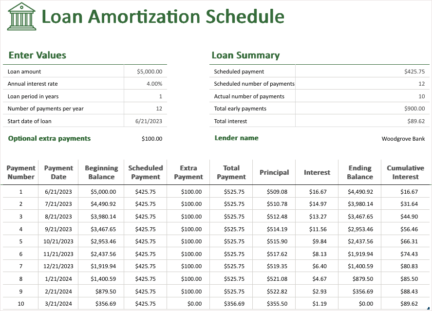 If you use Microsoft 365, you can take advantage of this loan amortization schedule. With it, you can calculate your total interest and payments with the option for extra payments.