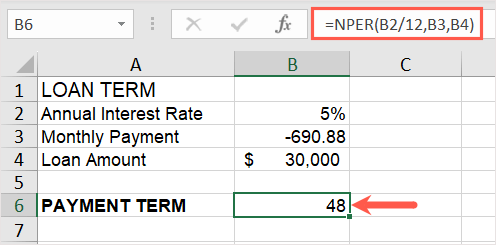 Here, we have the annual interest rate in cell B2, monthly payment in cell B3 (entered as a negative number), and loan amount in cell B4. You would enter the following formula in cell B5 to calculate your loan term: