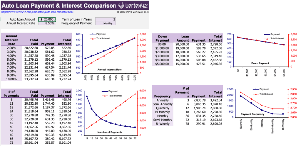 Start with the Loan Comparisons tab when deciding the best loan for you. You can see the payment amounts for various interest rates. You can also compare amounts based on the total number of payments, payment frequency, and different down payment amounts.
