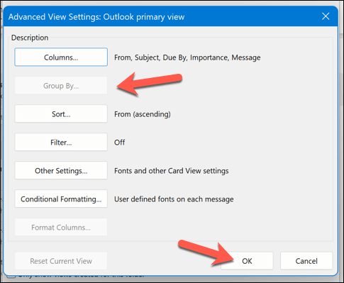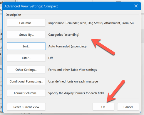 - In the Advanced View Settings dialog box that appears, you can change various settings and options for your view, such as: * Columns: You can add, remove, or rearrange the columns that appear in your table view. * Group By: You can group your items by any column or field in ascending or descending order. * Sort: You can sort your items by any column or field in ascending or descending order. * Filter: You can filter your items by specific criteria. * Format Columns: You can change the format of any column, such as the font, alignment, width, or color. * Conditional Formatting: You can apply different formats to your items based on certain conditions, such as the importance, category, or flag status. * Other Settings: You can change other settings for your view, such as the font size and style, the grid lines, the reading pane, and the item spacing. * When you’re done customizing your view, click** OK **to save your changes and apply them to your folder.